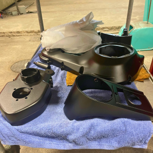 En sadel från LePera blir det. Nylackade kåpor till vxl-lådan och ny färg på luftrenare.