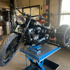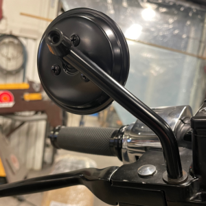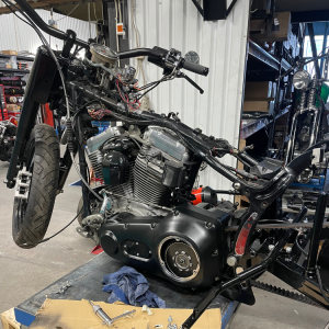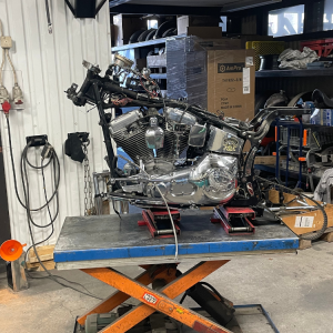 Krona, gaffel och framhjul på plats. Bromsoket har vi glasblästrat. El kopplas in och blinkers monteras under handkontrollerna. Nya backspeglar.