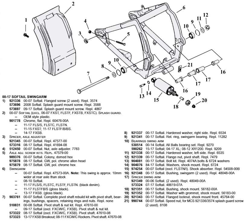 00-23 Softail; 04-22XL; 08-12 XR1200Replacement swingarm bearing only.Note: 921341 (11282) retaining ring is required and must be ordered separately.