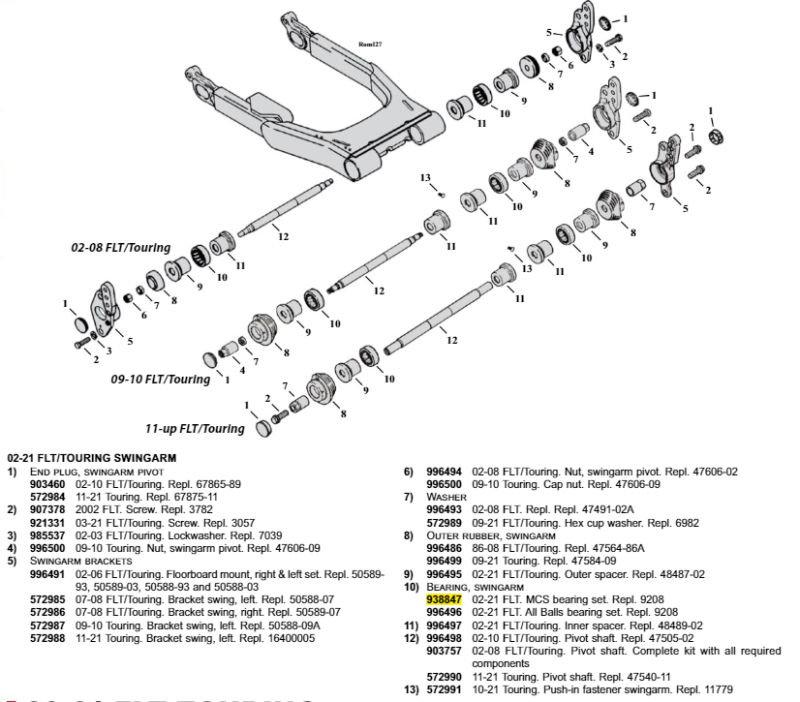 Headlamp mount bracket: 86-21 XL; 10-12 XR1200; 85-06 Softail Swingarm: 02-10 FLT/ Touring