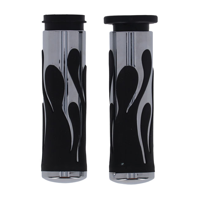 Chrome plated aluminum. Black rubber inlay with chrome flames.