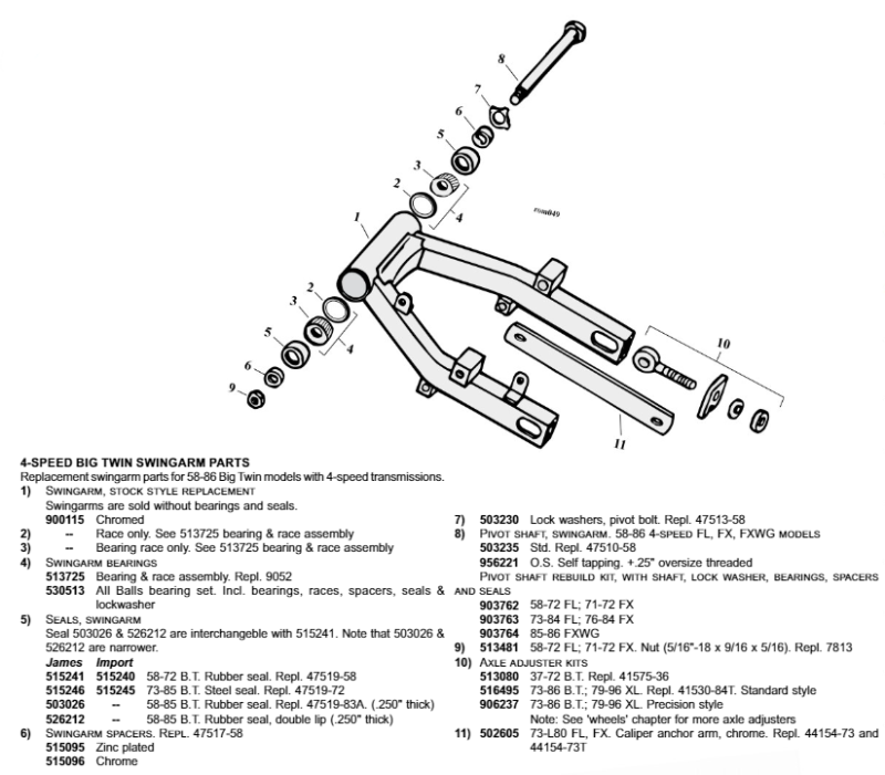 Wheel: 73-99 B.T.; TC (excl. 80-81 FLT rear); 73-99 XL front; 79-99 XL rear Swingarm: 58-86 4-sp B.T. (excl. Softail)