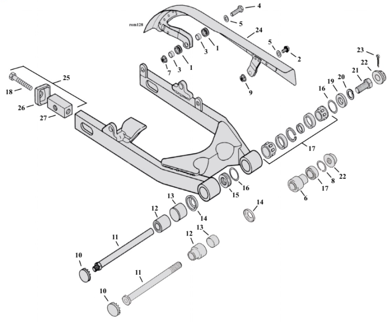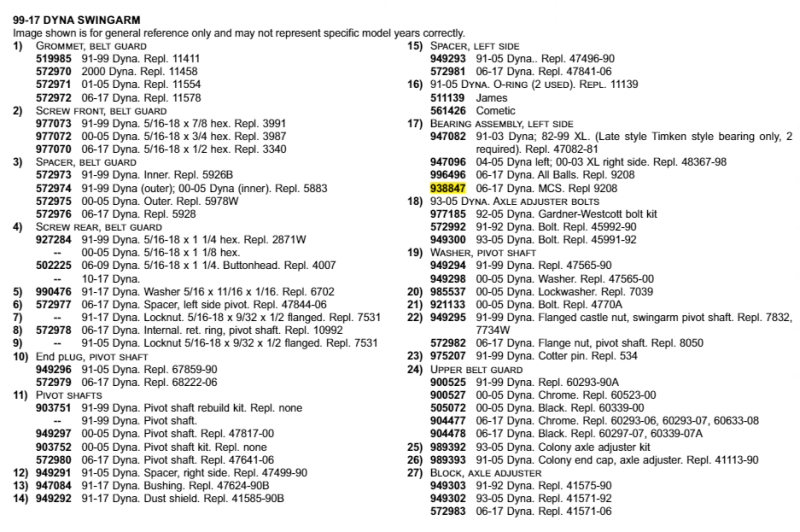 91-99 Dyna : spacer; belt guard 77-90 XL: Transm. door 2000 FLT: Mount screw distributing block brakeline on lower triple tree (1 used)
