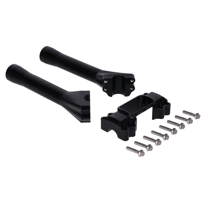 Svart anodiserad finish. Med top clamp som är maskinbearbetad för att passa den standard M8 Softail digitala instrumentmätaren. Detta är de äkta Brooklyn Brawler risers. Stolta att vara födda och maskinbearbetade från 6061 billet aluminium i Indian Larry Motorcycles maskinverkstad i Brooklyn, New York. Kommer med 3,5" (89 mm) center till center monteringsbultavstånd och är 1/2-13 gängade. Kompatibel med styren som har en 1" diameter på riser clamp-området.