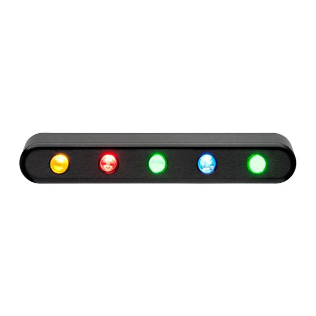 ''- Black anodized finish - Five colored LEDs in an aluminum housing - Colors green; red; blue; the two outer are yellow for turn signal use - Length of installed wiring harness is approx. 50cm - On the rear two M3 threaded holes are present for mounting - Weight; including wiring; just 18 grams - Dimensions: 46mm wide x 8mm high and 13mm deep