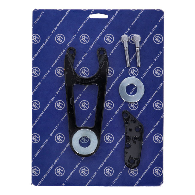 - Black anodized - CNC machined billet aluminum - For 3/4" (19.05mm) axle - For use with 11.5" brake rotor - Bracket is floating axle mounted - Bracket comes complete with the required center span to install the 125x2 2-piston caliper - Included center span comes with a brake anchor hole - See 952908 for a center span only; without brake ancher hole (available in chrome only) - Designed for custom left & right use on custom Springer forks